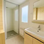 Les salles de bains des propriétés La Lodge Océane avec piscine, plage à pied comprennent également une douche et une machine à laver.
